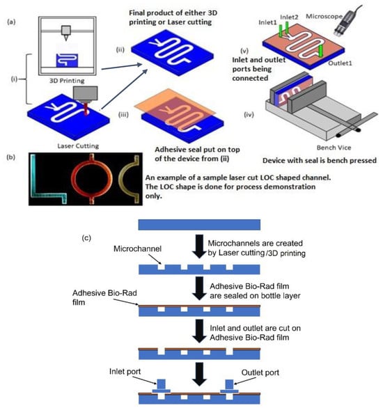 Rapid and outside cleanroom manufacturing processes, such as 3D printing and laser cutting to fabricate microfluidic lab-on-a-chip devices, are catalyzing research and innovation in portable analytical tools, point-of-care diagnostics, and personalized medicine. These processes enable swift design iterations, slashing time and costs in device development. Classical microfabrication techniques, such as lithography [1,2,3,4,5,6], can provide precision fabrication of lab-on-a-chip (LOC) devices; however, they often involve a longer turnaround time and higher cost. Rapid and out-of-cleanroom-based manufacturing of fluidic lab-on-a-chip (LOC) devices is increasingly gaining attention due to the compatibility of this approach with fabrication flowcharts in commonplace industrial facilities. Hence, it can improve on the otherwise poor accessibility and scalability of microfluidic cleanroom prototyping attempts. Various out-of-cleanroom-based fabrication techniques, such as laser writing [7], micromachining [8], injection molding [9,10] and hot embossing [11], are pursued because of their lower cost and faster turnaround time. In addition, some of these manufacturing methods also allow multilayer device fabrication. The fabrication of multilayer devices using classical microfabrication techniques is complex, and often not possible. Multilayer devices produced with layer-by-layer photolithography need secured bonding between multiple layers. The adhesive bonding method or conventional thermal compression bonding is challenging and usually requires ultrasonic [12], edge laser wielding [13], or chemical treatment [14] to enhance the bonding procedure.