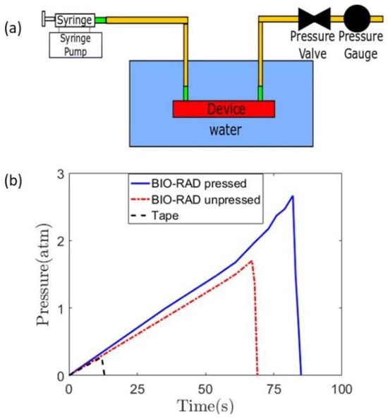(a) Complete setup of a leak test, with a syringe pump infusing the working fluid while a pressure gauge is attached to measure the pressure at the outlet of the channel. The microfluidic device is placed inside a water beaker. (b) Quantification of the leak test for three different cases, that is, Bio-Rad pressed, unpressed, and with scotch double-sided tape.