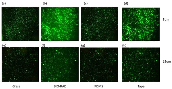 To study the quality of fluorescence imaging through the top seal cover, we separately loaded the microfluidic channel with fluorescence particle samples with a particle size of either 5 μm or 15 μm. The samples were observed under a microscope through four different types of top covers, namely, thin cover glass, Bio-Rad, PDMS and double-sided tape. Figure 3a–d shows the images of the 5 μm particles, and in Figure 3e–h, the images of the 15 μm particles are shown, which correspond to the setup for devices with different top seals.