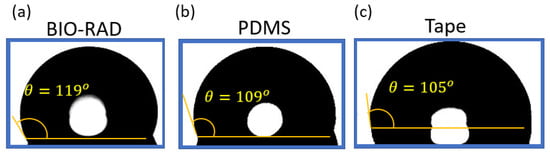 Contact angle θ of DI water on (a) Bio-Rad, (b) PDMS, and (c) tape, showing comparable hydrophobicity.