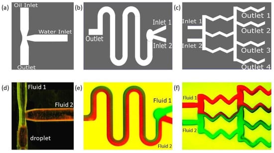Schematic and results of our 3D-printed classical microfluidic devices sealed with the transparent adhesive Bio-Rad film to create (a) a droplet generator, (b) a diffusion mixer (serpentine shape), and (c) a diffusion mixer (gradient mixer). Device designs are shown in the top row, and the experimental fluid flows through corresponding designs are shown in the bottom row (d–f). Note: experiments were performed when the devices were parallel to the ground.