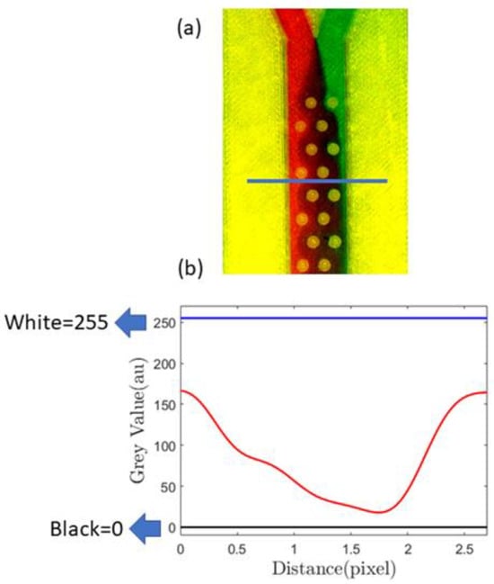 In Figure 6a, we demonstrate this passive mixing device that uses the proposed sealing film. The passive mixer uses cylindrical barriers to enhance mixing. A similar device was studied in detail using both the passive and active methods in our previous paper [68]. In this paper, however, we show various experimental results obtained with passive mixing methodology only. To measure the mixing efficiency, we first identified a cross-sectional position sufficiently away from the inlet, and a horizontal line designates that position (Figure 6a). In Figure 6b, the minima and maxima of the grayscale value corresponding to black and white are 0 and 255, respectively, and the red line indicates mixing.