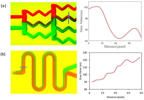 Quantification of the mixing for (a) the gradient mixer and (b) the serpentine mixer using the grayscale values obtained on the blue lines drawn across a channel leg for the mixer. Red and green color represents two different fluids.