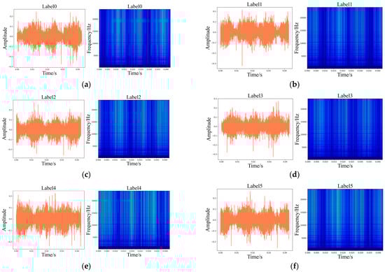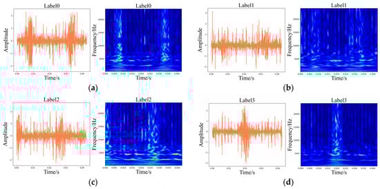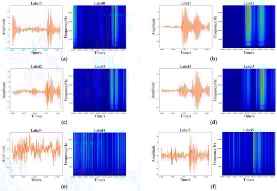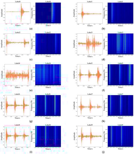 Time-domain diagrams of the acoustic signals and corresponding WT diagrams. (a) Label 0; (b) Label 1; (c) Label 2; (d) Label 3; (e) Label 4; (f) Label 5; (g) Label 6; (h) Label 7; (i) Label 8; (j) Label 9; (k) Label 10; (l) Label 11; (m) Label 12.