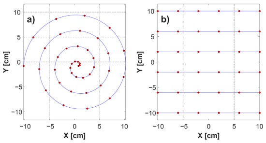 One possibility is to use a spiral scanning trajectory (Figure 1a) instead of a Cartesian trajectory. This allows for fast movement, and also considerably simplifies the synchronization problem, by eliminating accelerated motion from the scanner model. Practically, this system can be implemented by placing a sample on a rotating base and moving the measuring head along its radius [,]. The speeds of both elements during the scan of the entire sample are homogenous, thus eliminating any need for an additional synchronization method. However, this solution seems to be problematic in the case of larger samples, because a constant rotational speed results in a significant difference in pixel density between the center and the edge of the sample. In addition, there may be an imbalance in the rotation system in the case of a heavy sample with an uneven distribution of mass.
