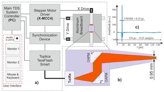 The measurement setup considered in this work consisted of a main controller (PC computer), a mechanical system comprising an XY scanner (gantry) and a motor controller, a TDS TeraFlash Smart system provided by Toptica Photonics from Munich, Germany, and a synchronization device (Figure 2a). The source of THz data in the system was the TeraFlash Smart platform, a TDS device which was operated according to the ECOPS scheme. The system used two 25 mW femtosecond lasers, operating synchronously. One of the lasers was modulated at 1600 Hz, which corresponded to the acquisition frequency fr of the THz pulses. Each pulse consisted of 3125 samples and lasted for 154 ps. The pulse reflected from a flat reference mirror is shown in Figure 2c, in which an amplitude of about 365 units and a half-width of 0.35 ps can clearly be seen. Averaging with jitter correction was used to reduce random noise components in the signal.