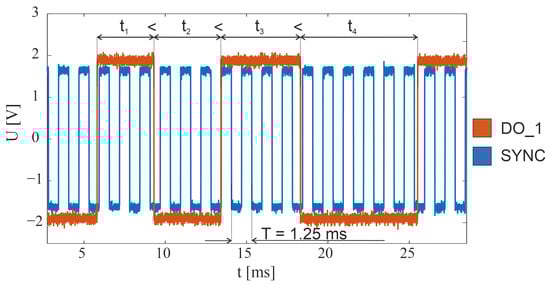 The TeraFlash smart platform is equipped with trigger input (TRIG) and synchronization output (SYNC). Synchronization output generates a square-wave signal with a frequency equal to half of the set data-rate frequency (800 Hz in the described system). Each edge of this signal indicates the acquisition of the next THz pulse. In the present study, we faced the problem that the output signal appeared as soon as the modulation was turned on (preparation stage), regardless of whether the data were read by the server application or not. As a result, after initiating the data readout, it was impossible to determine with which edge of the SYNC signal the first THz pulse—and, thus, all subsequent pulses—was associated. The solution to the above problem was to use the TRIG synchronization input to trigger the transfer of THz pulse data to the server. Data readout was configured to initiate transmission after a specific edge appeared on the TRIG input. In this way, the SYNC edge corresponding to the first THz pulse was indicated as the first SYNC edge after the TRIG edge. The SYNC signals oscillogram is shown in blue in Figure 4.