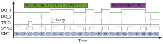 Oscillograms of synchronization signals in the THz scanner system. The edges of each signal mean the following: DO_1—drive shift by a given step, DO_2—start and end of drive movement, TRIG—THz data reading trigger, SYNC—THz pulse acquisition. The tables above the graph symbolize first input first output (FIFO) buffers that store subsequent counter values captured at edges of DO_1 (IC_1 FIFO) and DO_2 (IC_2 FIFO) signals.