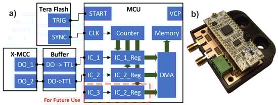 (a) Block diagram of the device implementing encoder-based synchronization; START—digital line used to trigger THz data read; CLK—counter clock input; IC_1, IC_2, and IC_3—counter capture inputs; IC_1_Reg, IC_2_Reg, and IC_3_Reg—counter capture registers; DMA—direct memory access controller; CVP—virtual com port; (b) a photo of the built system.