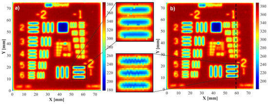 To evaluate the synchronization method described above, the acquired experimental results were compared with results obtained using traditional step-by-step scanning. The tested sample was a 3″ × 3″, negative, USAF 1951 target from Edmund Optics (Figure 3b). This is made in the form of a float glass plate of 1.5 mm thickness with a vacuum-disposed layer of durable chromium. It contains elements from number 1 (from group −2) to number 3 (from group 9). The reflective layer has a scratch and dig surface quality of 20–10.