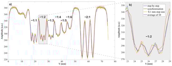 Both images are characterized by similar dynamic ranges, ranging from 183 to 378 for image a and from 185 to 382 for image b; these may be translated into contrasts of 194 and 197, respectively. To facilitate the resolution assessment, a vertical cross-section was determined through the x = 59 mm lines containing all horizontal lines from the −1 group of the USAF 1951 test, and the horizontal lines from element 1 of group −2 (Figure 8). Horizontal lines were used because the fast movement concerned the Y-axis, and so we might here expect differences between synchronous and step-by-step scans. As a criterion for distinguishing between lines in a given group, we applied a decrease in local dynamics (the difference between light and dark lines) to 10% of maximum dynamics. The images obtained by both methods were found to have the same resolution; on both, the smallest recognizable element was element 2 from the −1 group, characterized by 0.561 lines per mm. The step-by-step scanning time was 2 h. The described synchronization method reduced this time to 3.5 min.