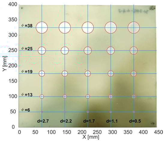 To evaluate the operation of the scanner based on the developed synchronization method using a real sample, a scan was performed with a specially prepared test sample. This was a 400 × 450 mm board made of fiberglass composite. The thickness of the sample ranged from 2.97 mm at the corners to 3.77 in the middle of the edge. A total of 25 flat-bottomed holes of diverse sizes and depths were made in the plate by milling. These holes served as structural defects that should be detected during scanning. The scan was performed from the reverse side of the plate. The locations of the holes, their sizes, and their depths are shown in Figure 9.