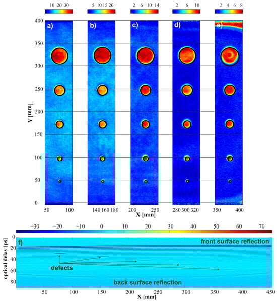 Based on the obtained results, a series of C-scans was determined in which the pixels corresponded to the peak-to-peak values of the THz pulse at time intervals of 4.5 ps. The positions of subsequent intervals were set to the values of optical delays corresponding to the depths of subsequent defects (Figure 10a–e). Displaying the results for defects at different depths in one common C-scan was impossible, due to significant differences in the intensity of pixels resulting from greater attenuation for deeper defects. Below, Figure 10f shows a B-scan for a horizontal line passing through a medium-sized defect group (Y-axis of about 172 mm). All five defects are visible in the scan, with those placed deeper being less clear. In C-scans, image detection of spherical defects was carried out using the circle Hough transform (CHT) method. All 25 defects were detected correctly.