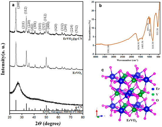The ErVO4@g-CN compound was further analyzed with FTIR for bond formation details, as shown in Figure 1b. The sharp peak at 533.38 cm−1 describes the Er-O stretching vibrations, and the V-O is represented by the stretching vibrations at 997.61 cm−1. The peak at 1011.20 cm−1 corresponds to the stretching vibration of (V=O). The peaks at 1401.56 cm−1 and 1634.91 cm−1 are due to the stretching vibrations of (C-N) and C=N in g-CN. The stretching vibrations of (N-H) in −NH2 and =N−H can be defined from the broad peak at 3381.80 cm−1. The confirmed s-triazine ring of the bending vibration is at 810.39 cm−1 [34,35,36,37]. The tetragonal crystal system with a 141/amd space group of ErVO4 is shown in Figure 1c. Er3+ is attached to eight equivalent O2− atoms, and V5+ is bonded to four equivalent O2− atoms.