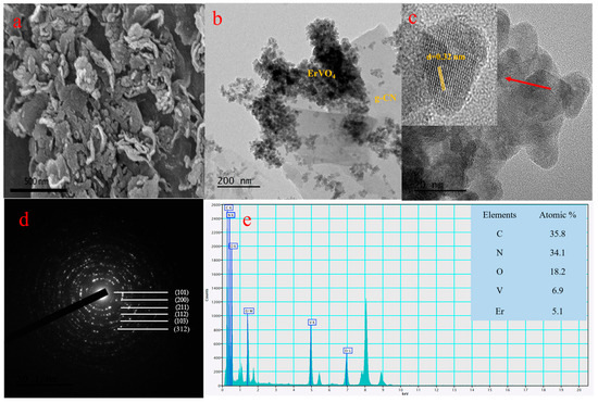 Coral patterns, such as the nano-sized ErVO4-attached g-CN, can be seen in the Figure 2a FE-SEM images. A further examined ErVO4@g-CN microstructure from the HR-TEM images is displayed in Figure 2b,c. Nano-sized ErVO4 can be seen on sheet-like g-CN from the HR-TEM images in Figure 2b; the lattice fringe with an interplanar spacing value of 0.32 nm corresponding to the (200) crystal plane of ErVO4 is exhibited in Figure 2c. Also, the SAED image of Figure 2d reflects the crystal plane from the XRD analysis. The elemental distribution of compounds from the EDS analysis was studied, and this analysis further proved the presence of elements. The atomic percentages of C, N, O, V, and Er are 35.8%, 34.1%, 18.2%, 6.9%, and 5.1%, respectively, as depicted in Figure 2e. Furthermore, EDS mapping from the TEM images confirms the presence of erbium, vanadium, oxygen, carbon, and nitrogen, as shown in Figure S2a–f.