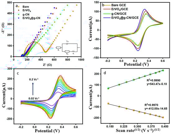 (a) EIS and (b) CV measurements of bare GCE, ErVO4/GCE, g-CN/GCE, and ErVO4@g-CN/GCE. (c) Different scan rates for ErVO4@g-CN/GCE in the presence of 5 mM [Fe(CN)6]3−/4− and 0.1 M KCl and (d) Corresponding plot of current vs. square root of scan rate.