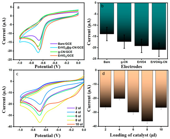 (a,b) CV profiles of bare GCE, ErVO4 GCE, g-CN GCE, and ErVO4@g-CN-modified GCEs in the presence of 200 μM DMZ at a scan rate of 50 mV s−1 in 0.1 M PBS (pH 7) and corresponding bar graph (c,d) Current changes in different catalyst amounts in the presence of 200 µM DMZ and 0.1 M PBS (pH 7) and corresponding bar graph.
