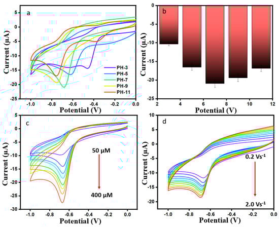 The influence of different pH values (3, 5, 7, 9, and 11) on current was investigated in the presence of 200 µM DMZ (scan rate 50 mVs−1) for ErVO4@g-CN/GCE. It can be seen in Figure 5a,b that Ip increases from pH 3 to 7 and decreases from pH 7 to 11. The data show that Epc was shifted toward a negative potential with an increasing pH (7–11) due to low current density hydrogen ions. It is shown that a maximum reduction current of −20.91 µA was obtained when pH 7 was used in the medium, as indicated by the equal numbers of proton and electron transfers in the reaction; for this reason, pH 7 can be used for any further analyses [39].