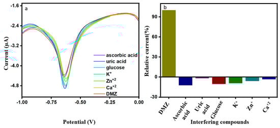 (a,b) DPV response of 20 µM of DMZ in the presence of co-interfering compounds; and the corresponding bar graph.