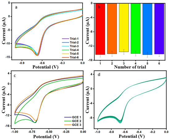 (a,b) Plot of repeatability in the presence of DMZ 100 µM and correlated bar graph. (c) CV plot of reproducibility in the presence of DMZ 100 µL and pH = 7 PBS. (d) CV plot of cycle stability for 60 cycles in the presence of DMZ (100 µM) and pH = 7 PBS.