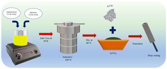The hydrothermal process was followed in synthesizing ErVO4 in order to obtain nanocrystalline material. Erbium (III) nitrate pentahydrate (ErH10N3O14) and ammonium metavanadate (NH4VO3) were added in a stoichiometric ratio of 1:2 to the 40 mL of distilled water in a small beaker and then stirred. Next, 0.03 g of urea was added to the solution, and the resultant solution was transferred to a Teflon autoclave after 2 h of stirring and heated at 180 °C for 18 h. The resultant green-colored product was centrifuged with water/ethanol and washed several times. Finally, ErVO4 was dried at 80 °C for 24 h to be used for further experiments (Scheme 1).