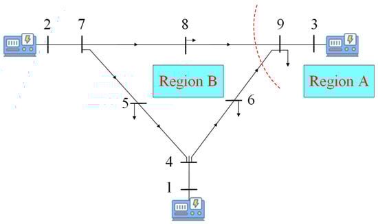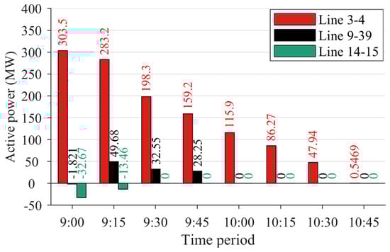 Suppose that high wind occurs at 9:00 throughout the power system, causing Line 14–15, Line 9–39, and Line 3–4 trips in succession. This results in the isolated operation of the local power grid, as shown in the following Figure 8. The occurrence process of successive failures that is measured in the actual power system is as follows:
