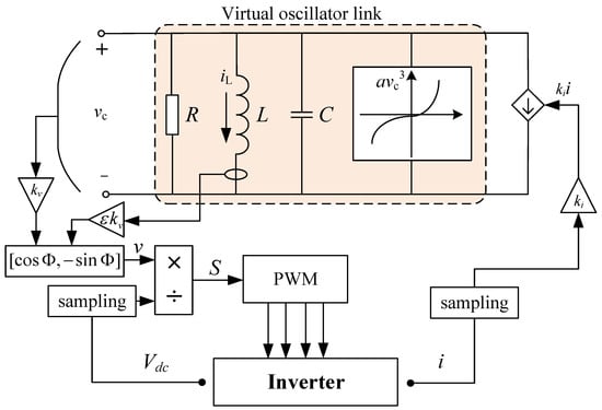 Figure 2 depicts a typical VOC inverter of the Van der Pol (VdP) type, comprising a VdP type of VO, DG, and an inverter. The circuit model of the VdP type of VO consists of three parallel parts: (1) an LC resonance loop that can generate a resonant frequency and whose oscillation characteristics are reflected in the bidirectional energy flow between a virtual capacitor and a virtual inductor; (2) a negative impedance, which is essential to the system’s transient process and closely related to the inertial frequency regulation scale; (3) a voltage-controlled current source.