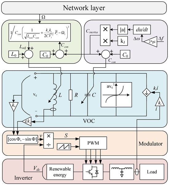 On the other hand, extreme weather can lead to fragile, isolated local power supply areas with insufficient resources, poor inertia, and low disturbance resistance, threatening frequency stability. Advanced frequency regulation methods are required for their stability. The increasing presence of power electronic interfaces in power grids has enhanced regulation flexibility. However, traditional controls like droop and virtual synchronous machine controls in power electronics, such as energy storage units, are slow to respond to disturbances, particularly in isolated power areas. Recently, virtual oscillator control (VOC) has become important for frequency regulation in power systems rich in power electronics [,]. VOC, using the digital control of converters, simulates LC second-order oscillation dynamics. Research on VOC aims to improve inverter performance and practical VOC applications, such as power scheduling in grid-connected modes, islanding support, and enhanced disturbance management. A challenge is balancing VOC’s preference for larger inertia for angular frequency stability against the need for smaller inertia for a better active power response. Thus, a flexible, adjustable VOC beneficial for the frequency response is preferred. Additionally, developing a VOC-based controller that minimizes frequency errors is necessary.