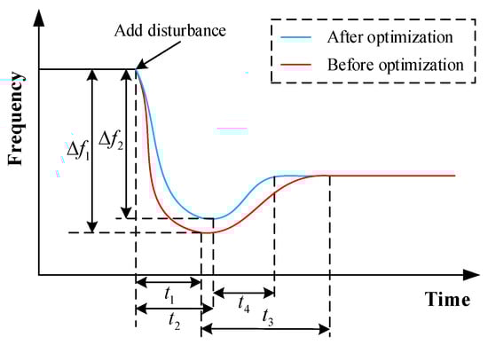 Figure 4 shows the transient frequency characteristics of the power system before and after optimal inertia frequency regulation optimization. The red curve is the frequency characteristics before optimization, and the blue curve is the frequency characteristics after optimization. Time scales and are the frequency dip and frequency recovery scales before optimization, while time scales and are the frequency dip and frequency recovery scales after optimization, respectively. At the scale of or , the frequency change rate rises sharply after the disturbance appears and gradually decreases within this time scale. However, at the or scale, the frequency change rate gradually increases. This paper expects a longer frequency drop process with a smaller frequency deviation, that is, and . Also, the frequency recovery process is expected to be faster, that is, .