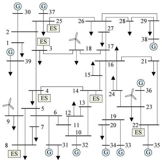 This paper utilized the IEEE-39 power system in the simulation experiments. This system comprises 38 transmission lines, 10 generators, 3 wind farms, and 6 energy storage units. A detailed visualization of the power system is presented in Figure 6. The parameters of the generators are listed in Table 1. It is assumed that the wind speed in the wind farm follows a Weibull distribution, and the scale factor, shape factor, cut-in wind speed, rated wind speed, and cut-out wind speed are listed in Table 2. The parameters of the energy storage units are listed in Table 3. VOC is employed in the inverters of the energy storage units, and they are coordinated through the cyber network layer shown in Figure 7. The parameter settings of the VO controllers for the energy storage units are listed in Table 4.