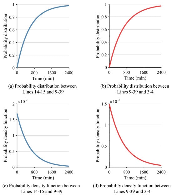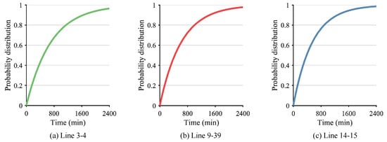 Under extreme weather conditions, the failure probability of a transmission line can be expressed using a Poisson model. This is because the Poisson model is a tool for characterizing stochastic and rare occurrences of events. In extreme weather conditions, the occurrence of transmission line faults may exhibit stochastic and rare characteristics. The Poisson model is well suited to capturing this stochastic and rare behavior with a certain degree of accuracy [,] and is therefore employed to describe the probability of transmission line faults under extreme weather conditions. Given a specific extreme weather event, the probability of a single-component failure, taking a line outage as an example, is described by a Poisson model as follows []: