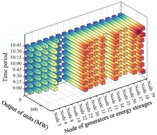 We utilize Figure 1 for a more intuitive explanation. Assuming that Node 9 bears a substantial load at time while Node 3 exhibits a limited generation level at the same time, at this juncture, the load at Node 9 will be sustained by Lines 3–9, 6–9, and 8–9. Furthermore, employing the approach outlined in Section 2, if it is possible to forecast the occurrence of faults on Lines 6–9 and 8–9, and the time of occurrence for each fault is denoted by and , respectively, it becomes evident that, following the fault on Line 6–9, the load at Node 9 will be supported by Lines 3–9 and 8–9. Subsequently, after the fault on Line 8–9, the load at Node 9 can only be supplied by Line 3–9. If the ramping capability of the generator at Node 3 is insufficient to meet the load requirement at Node 9 at time , it becomes necessary for Node 9 to curtail a portion of its load to maintain supply–demand equilibrium. One potential resolution is to preemptively increase the output of the generator at Node 3 upon forecasting the fault occurrences on Lines 6–9 and 8–9 at times and , thereby mitigating Node 9’s reliance on Lines 6–9 and 8–9 for supply and ensuring that the generator’s output at Node 3 is able to ramp up to meet the load requirements at times and .