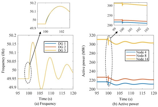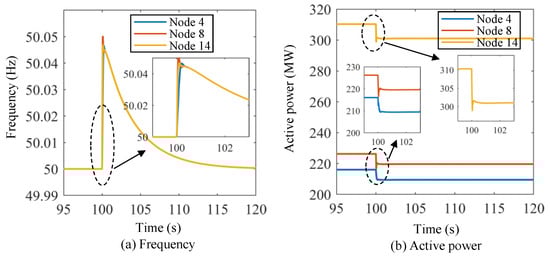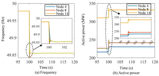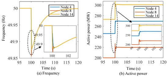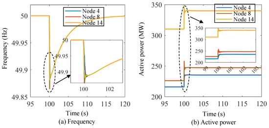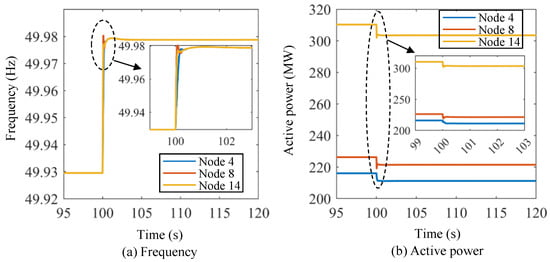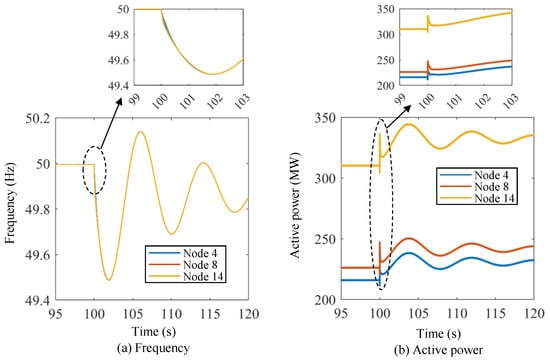 Scenario IV: The initial active power of the three energy storage units at Nodes 4, 8, and 14 of Region B is 216.03 MW, 226.24 MW, and 310.31 MW, respectively. The output of the wind farm at Node 9 changes from 400 MW to 332 MW suddenly at t = 100 s to emulate the frequency event.