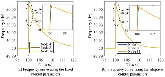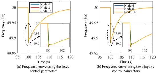 Frequency curves under Scenario IV using the fixed control parameters and the adaptive control parameters.