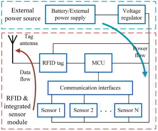 Figure 2 shows the block diagram of the semi-passive RFID tag-integrated sensor. In contrast to the passive RFID tag-integrated sensor, the semi-passive sensor contains no RF energy harvester. An external power supply or battery is usually used. The semi-passive sensor can drive sensors with higher power consumption and can operate continuously, which is suitable for the environmental monitoring of the manufacturing line.