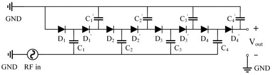 According to the existing results, the Cockcroft–Walton voltage multiplier and the Dickson multiplier share similar RF energy harvesting performances. In order to keep a simple and easy-to-fabricate circuit architecture, the Dickson multiplier is applied. Figure 3 shows a four-stage Dickson multiplier. In the Dickson multiplier, two capacitors and two series diodes constitute one converting stage. The capacitors are connected between one diode and the DC output or the RF in. The RF incident wave has a fluctuation, and the input voltage thus varies between negative and positive. When the RF incident wave voltage is negative, the charge is accumulated at the cathode of the diodes D1, D2, D3, and D4. When the RF incident wave voltage changes to positive, the diodes D1′, D2′, D3′, and D4′ are activated and the charge is then gathered through these diodes. The charge is continuously carried to the next stages through this cycle when receiving RF input signals. The final output voltage is proportional to the amount of charge at the output node.
