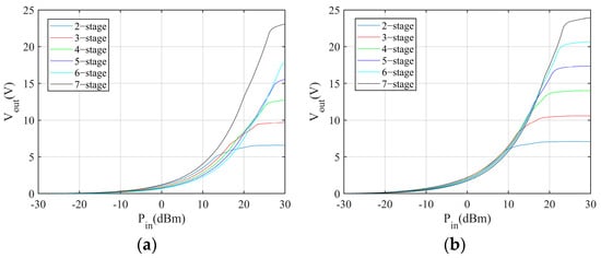 Output power of Dickson multipliers with different numbers of stages: (a) 5 kΩ load, (b) 15 kΩ load.