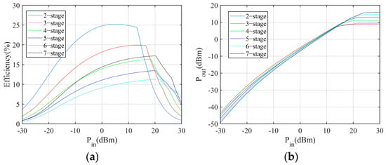 where Po and Pin are the harvester output power and incident power, respectively. According to the results, the multiplier with less stages performs better in low incident power conditions.