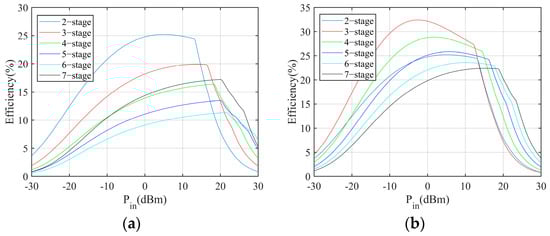 Power conversion efficiency of Dickson multipliers with different numbers of stages: (a) 5 kΩ load, (b) 15 kΩ load.