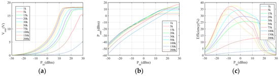 Performances of the 5−stage Dickson multiplier: (a) output DC voltage, (b) output DC power, (c) power conversion efficiency.