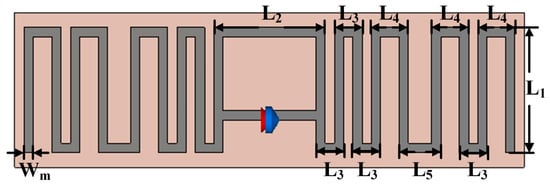 This work uses the UCODE I2C tag fabricated by the NXP Semiconductor with programmable features. The UCODE I2C tag has a characteristic impedance of 13.8 − j210 Ω. Therefore, the tag antenna should have an impedance of 13.8 + j210 Ω, which is a conjugate matched to the tag chip. A T-matched half-wave dipole MLA is designed as the tag antenna. Figure 10 shows the designed MLA, and Table 1 illustrates the detailed dimensions of the MLA. The antenna is designed on an FR-4 substrate with a relative dielectric constant εr, substrate thickness Hs, and copper thickness Hc. The overall length of the conductor is near half-wavelength at 866.5 MHz, which makes the antenna a half-wave dipole antenna.