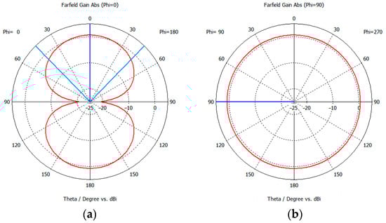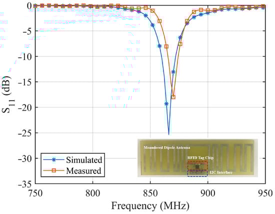 The designed MLA is simulated using CST Microwave Studio, and the prototyped antenna is measured using an E5071 programmable vector network analyzer in an anechoic chamber. Figure 11 shows the simulated and measured S11 of the fabricated MLA. The fabricated MLA has an impedance bandwidth (S11 < −10 dB) of 9.20 MHz (1.04%, 865.01–874.21 MHz), which can cover the UK UHF RFID band. Figure 12 shows the simulated far-field radiation pattern of the MLA on the E-plane and H-plane. The red line indicates the far-field gain. The blue line shows the half power beam width (HPBW). The MLA has a maximum gain of 0.677 dB, with a 0.2 dB maximum gain variation on the H-plane. The HPBW is 87 degrees, which can fulfil the RFID tag-integrated sensor applications.