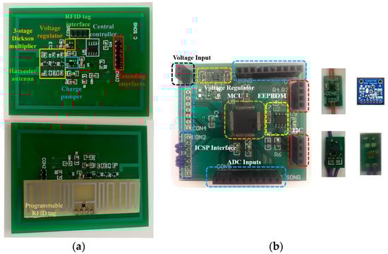 Fabricated RFID tag-integrated sensors: (a) passive design, (b) semi-passive design.