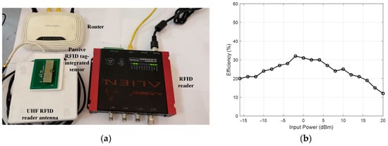 To evaluate the RF energy harvester performance, the passive RFID tag-integrated sensor is set up, as shown in Figure 14a. The RF signal is transmitted by the Alien 9900+ UHF RFID reader with a 30 dBm output and a 5 dBi circularly polarized UHF RFID reader antenna. The passive RFID tag-integrated sensor is moved away from the reader antenna. An MCU with a built-in ADC is used to measure the voltage of the storage capacitor. The time stamp is added to the sampled voltage. Then, a time–voltage matrix is recorded. The single-cycle sensing time, the first-time charging time (voltage of storage capacitor rising from 0 V to 2.4 V), and the re-charging time (voltage of storage capacitor rising from 1.8 V to 2.4 V) are recorded. According to the results, one sensing cycle takes 195 ms, and the discharge time is sufficient to support the sensing cycle. At the distance of 200 cm, the charging time of the cold start is 70.26 s, while the re-charging time is 12.01 s. The maximum operation range is about 350 cm. When measuring the power conversion efficiency of the RF energy harvester, the output power of the RFID reader is gradually decreased from 20 dBm to −16 dBm. The calculated efficiency is shown in Figure 14b. The maximum power conversion efficiency is about 31%. For the semi-passive design, the sensor power is guaranteed by a battery or an external power supply. Therefore, the operation range of the semi-passive design is same as that of the RFID tag detection range, which is 8 m in this case.