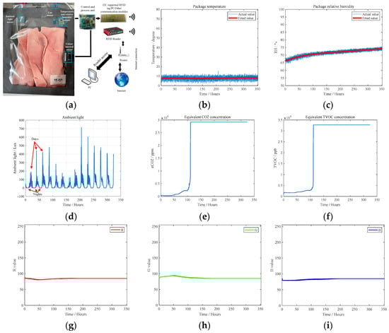 The RFID tag-integrated sensing results when measuring ham products: (a) experiment setup, (b) temperature, (c) relative humidity, (d) ambient light density, (e) CO2 concentration, (f) TVOC concentration, (g–i) color information (R,G,B).