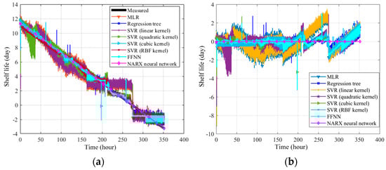 Based on the ham sensing experiments, this work proposes an AI-based food product QAS approach as a demonstration. To prepare the training dataset, multiple experiments are repeated. The ham products are stored in the different conditions until they are spoiled, such as at room temperature and in the refrigerator. The sensing is performed every 5 min by scanning the RFID tag-integrated sensor. With the data collected during the ham tests, the model for ham QAS is built with the AI-based sensor fusion algorithms. The measured data form a time series dataset that contains multiple input sensory variables, including the temperature in degrees, RH as a percentage, TVOC concentration in ppb, CO2 concentration in ppm, RGB information, ambient light intensity in lux, color temperature in Kelvin, and storage time in days. The output dependent variable is the shelf life. The multi-sensing time series data can reflect the quality and the quality change trend. Therefore, the multi-sensing data can be utilized to assess the quality of food products using machine learning approaches. The QAS process is to build regression models between these data and the shelf life. To establish the training dataset, 60% of the measured product data is used as a training dataset. The validation dataset and test dataset each take 20% of the measured product data. Five-fold cross-validation is used during validation. The regression algorithms, including linear regression (LR), regression tree, support vector regression (SVR), the feedforward neural network (FFNN), and the nonlinear autoregressive model with the exogenous input (NARX) neural network are investigated. The block diagram of the NARX neural network is shown in Figure 16 [40]. NARX is a type of recurrent neural network. As shown in Figure 16, compared with conventional RNN, the autoregressive part (y) of the NARX neural network considers past values of the time series itself in addition to the time series exogenous input (x). d represents the delay of the time series data. A three-layer NARX neural network is used. Also, the NARX model incorporates a nonlinear mapping function that captures complex relationships within the data. This nonlinear mapping allows the model to handle systems with nonlinearity, making it more flexible in representing diverse dynamics. As the QAS process is a nonlinear process with RFID tag recorded time series data, the NARX model is suitable. The trained models are used to perform the QAS of unseen ham product data. The corresponding storage time-evaluated shelf life curves are obtained, and the residuals are calculated; these are shown in Figure 17a and Figure 17b, respectively.