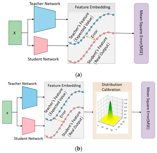 A novel intermediate feature-based knowledge distillation method. (a) Previous intermediate feature-based knowledge distillation method; (b) a knowledge distillation method based on feature error distribution calibration proposed in this study.