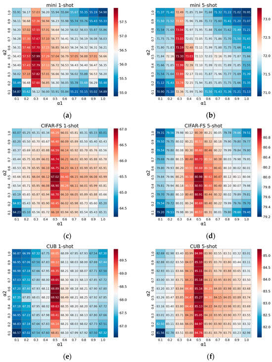 Heatmap visualization of α1 and α2 grid search on three datasets. (a) Grid search results on MiniImageNet in 1-shot task; (b) grid search results on MiniImageNet in 5-shot task; (c) grid search results on CIFAR-FS in 1-shot task; (d) grid search results on CIFAR-FS in 5-shot task; (e) grid search results on CUB in 1-shot task; (f) grid search results on CUB in 5-shot task.