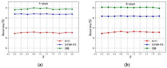 Test experiments under different values of β on three datasets: (a) 1-shot test accuracy under different values of β; (b) 5-shot test accuracy under different values of β.