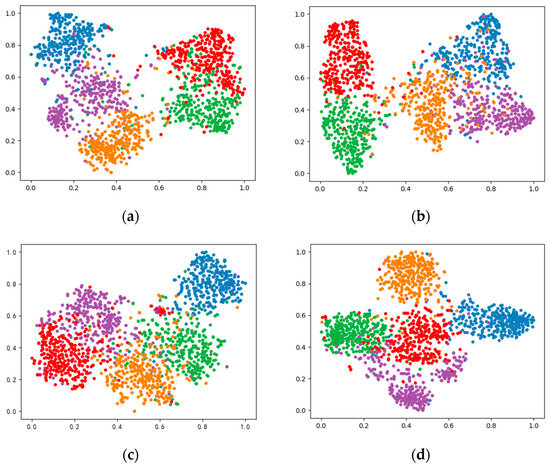 The t-SNE visualization of feature distributions on MiniImageNet and CIFAR-FS. (a) The feature distributions of 5 randomly selected novel classes from MiniImageNet by the baseline method; (b) the feature distributions of 5 randomly selected novel classes from MiniImageNet by our method; (c) the feature distributions of 5 randomly selected novel classes from CIFAR-FS by the baseline method; (d) the feature distributions of 5 randomly selected novel classes from CIFAR-FS by our method, where each color represents a distinct category of features.